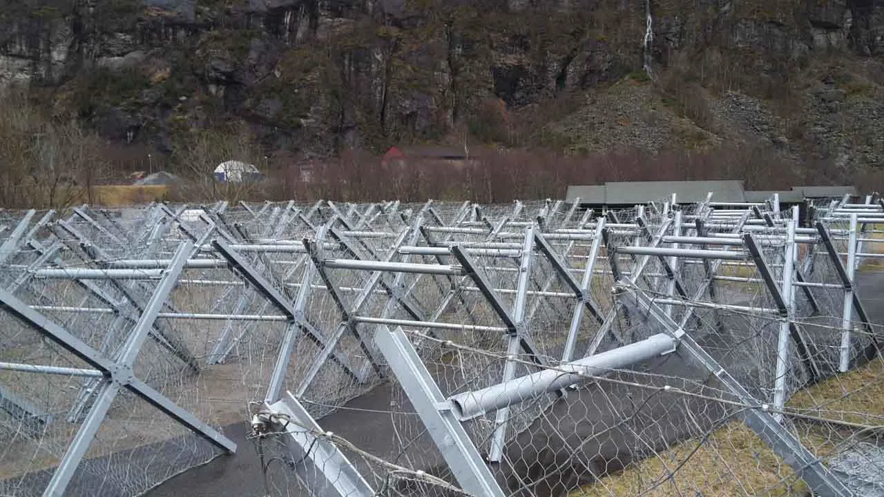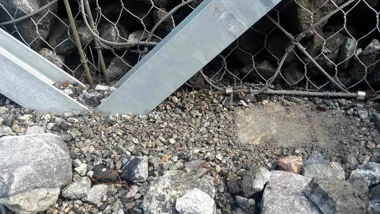 It is a metal structure with two rigid retaining faces connected with a tubular profile of variable length, depending on design specifications, and a system of steel cables. It is a metal structure, with light weight, easy to transport and quick to install, even in this conformation.