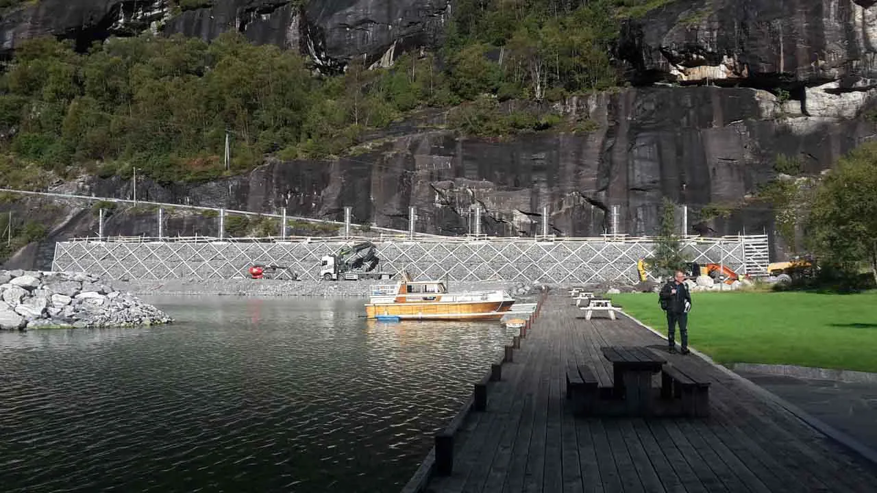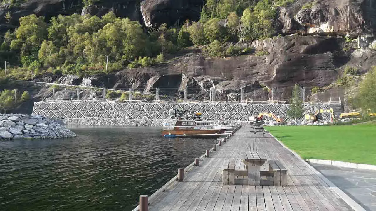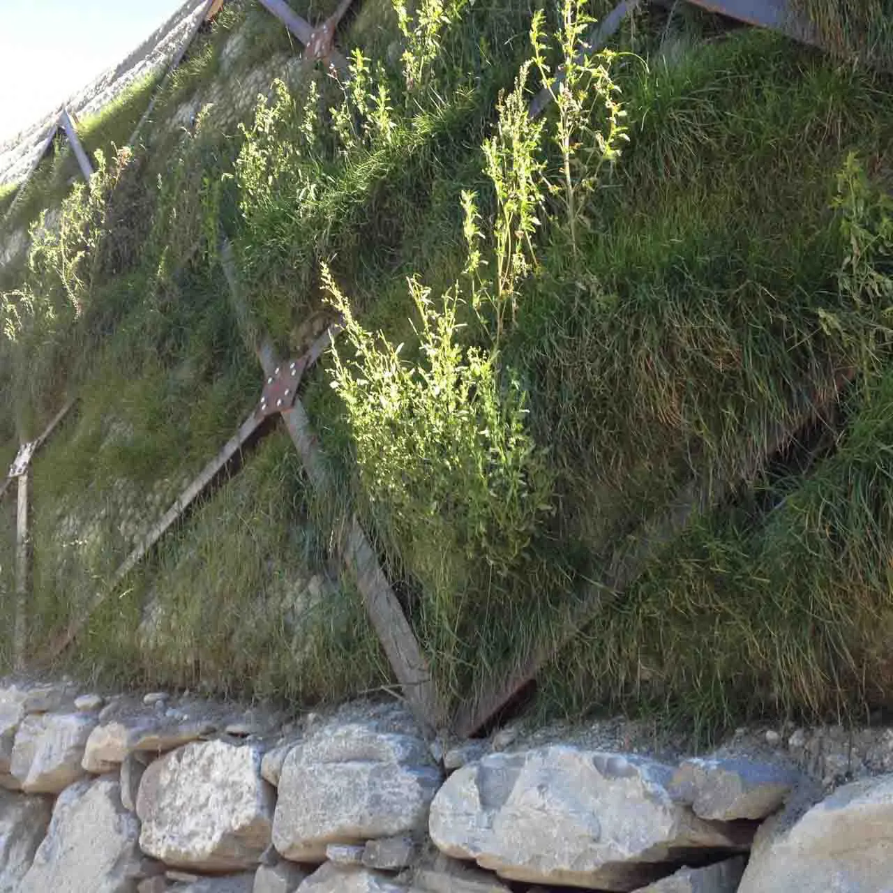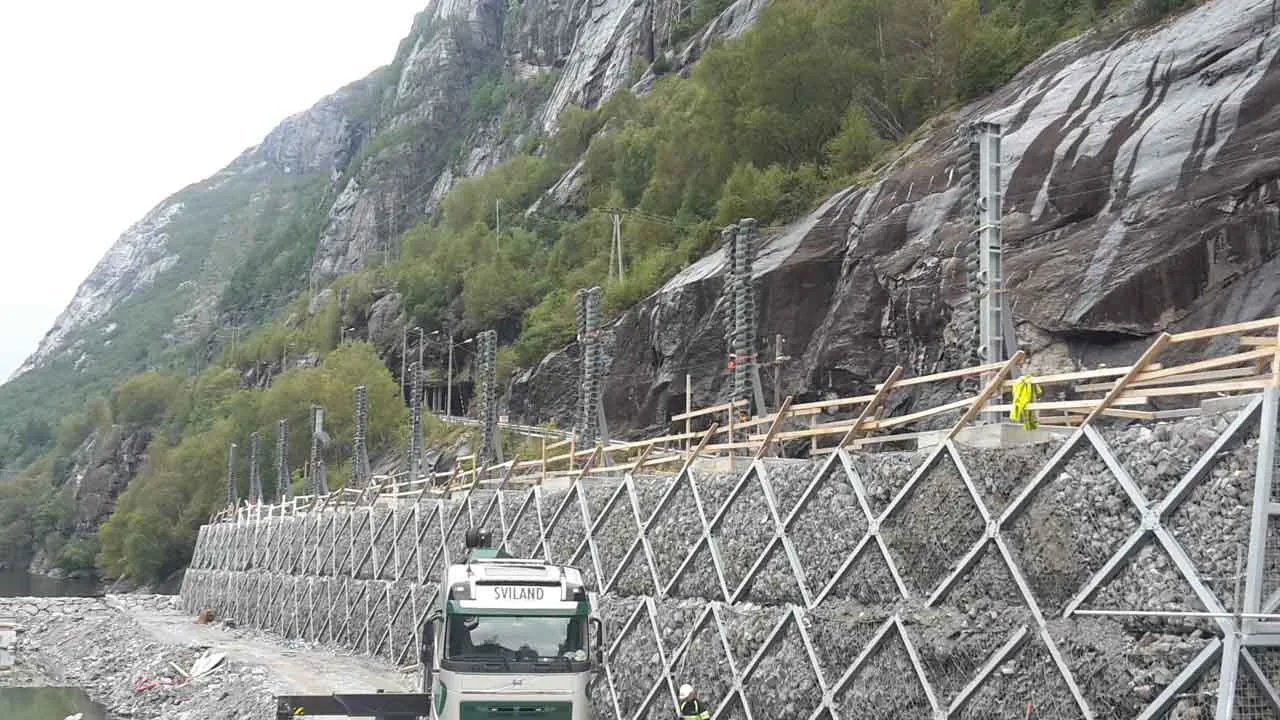 Filling may be done directly by mechanical equipment. In this case, the bracing ropes that connect the two retaining faces have a straight course and therefore do not, considering the size of the elements, constitute an obstacle for the backfilling and compaction with vibrating vehicles.