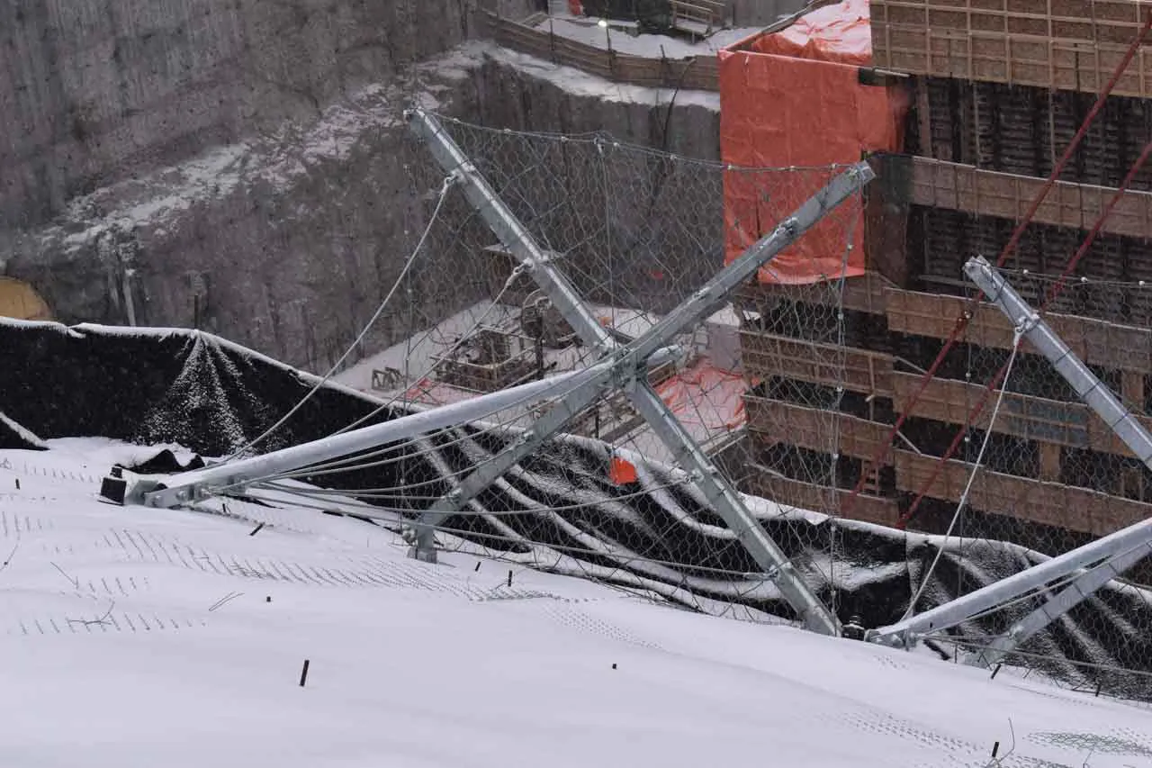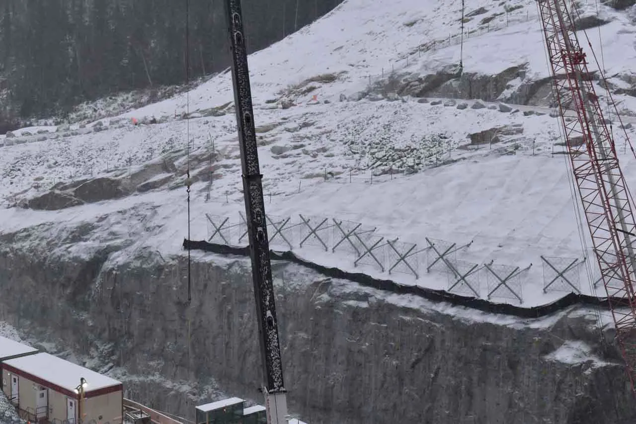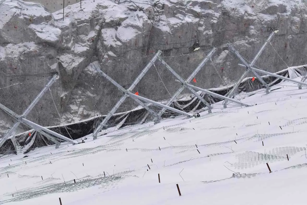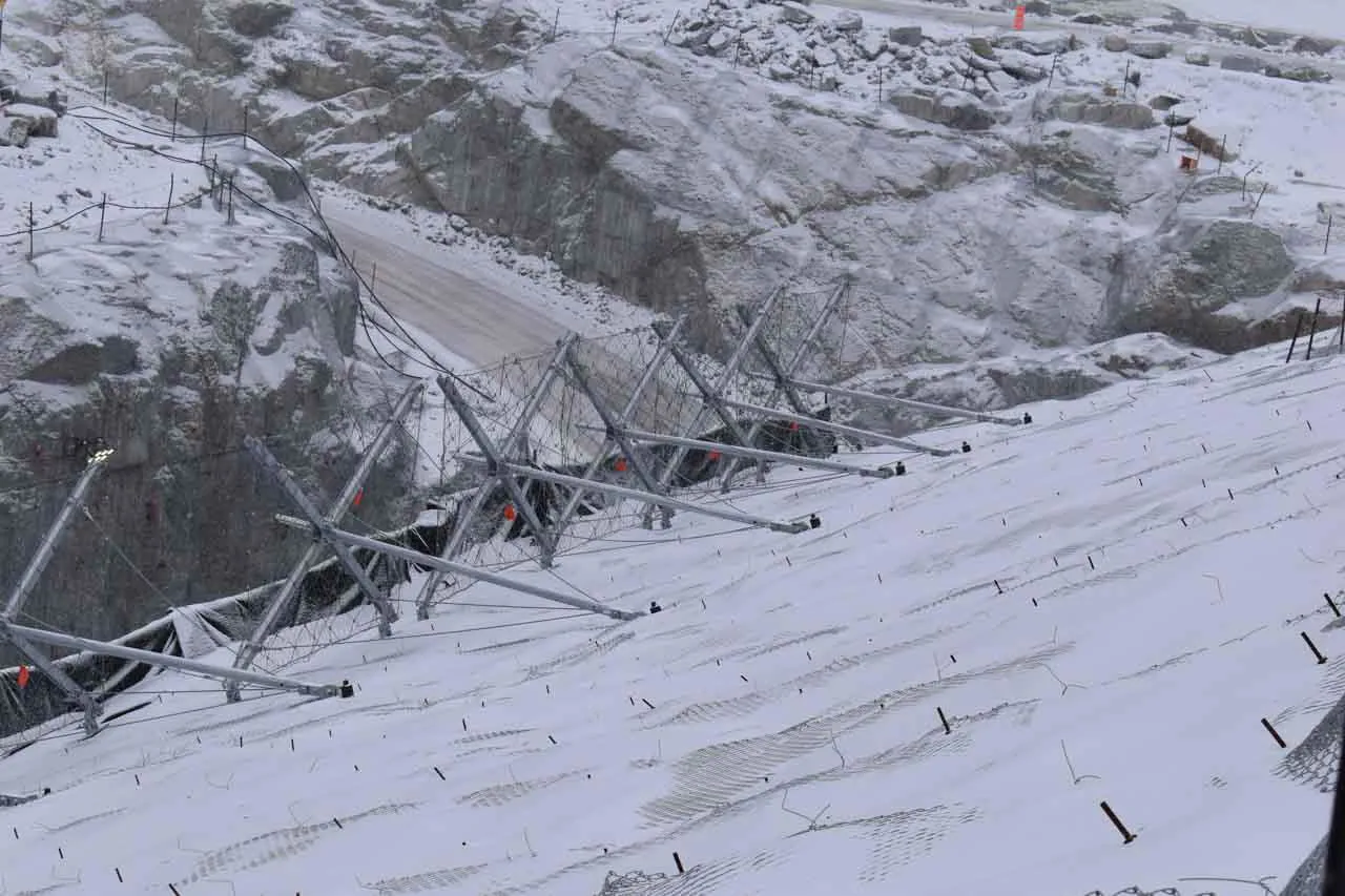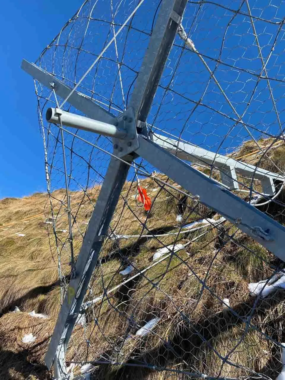 Downstream counterpull system, applied directly to the structure, whose purpose is to counteract the occurrence of flexural stresses in the stems caused by the presence of ice plates and snow on the bracing ropes positioned in the upper portion of the ErdoX Snow barrier; This part of the structure is a unique feature and was patented by Betonform to find a solution to a problem that caused devastating deformation over time in classic single-anchor barriers.