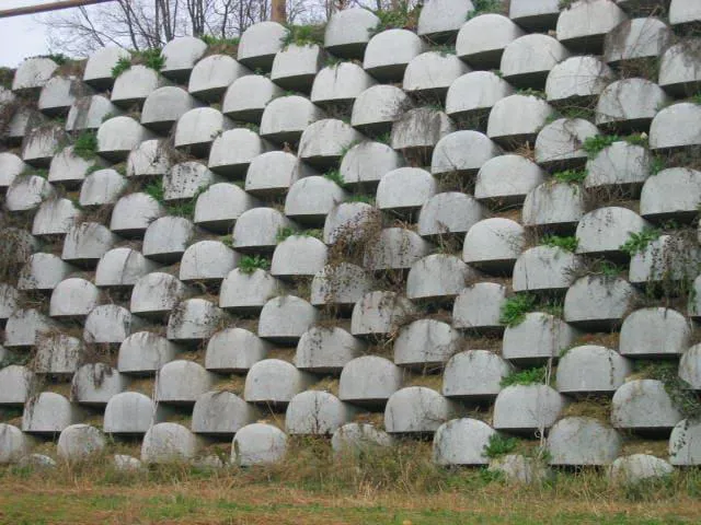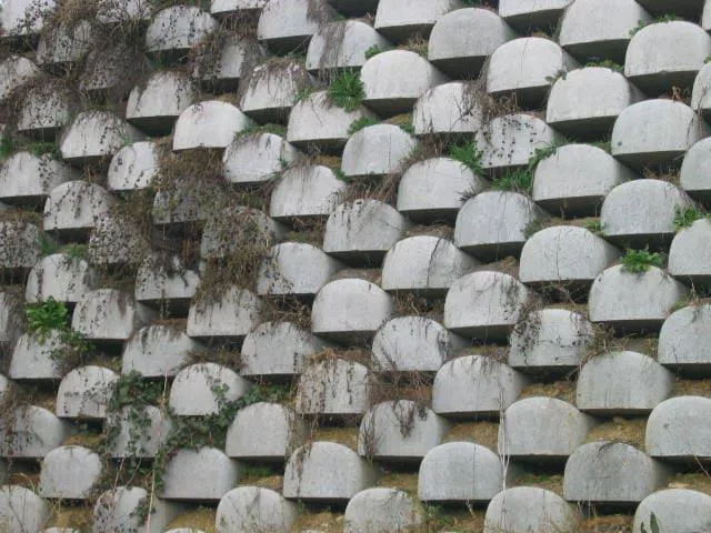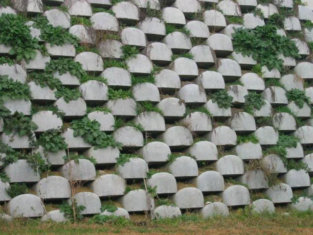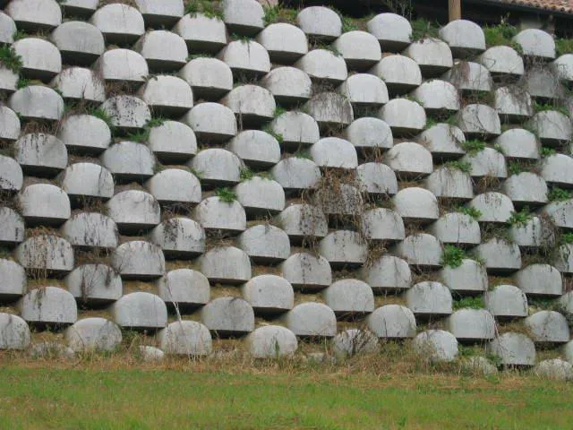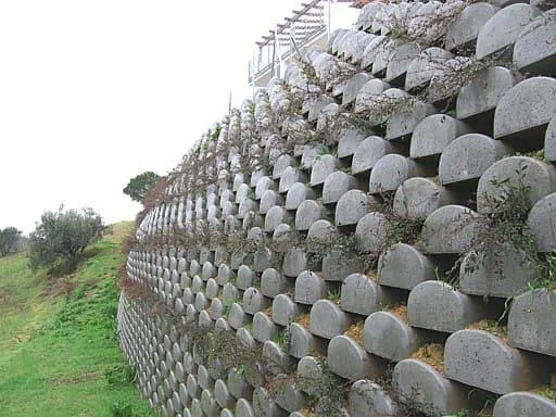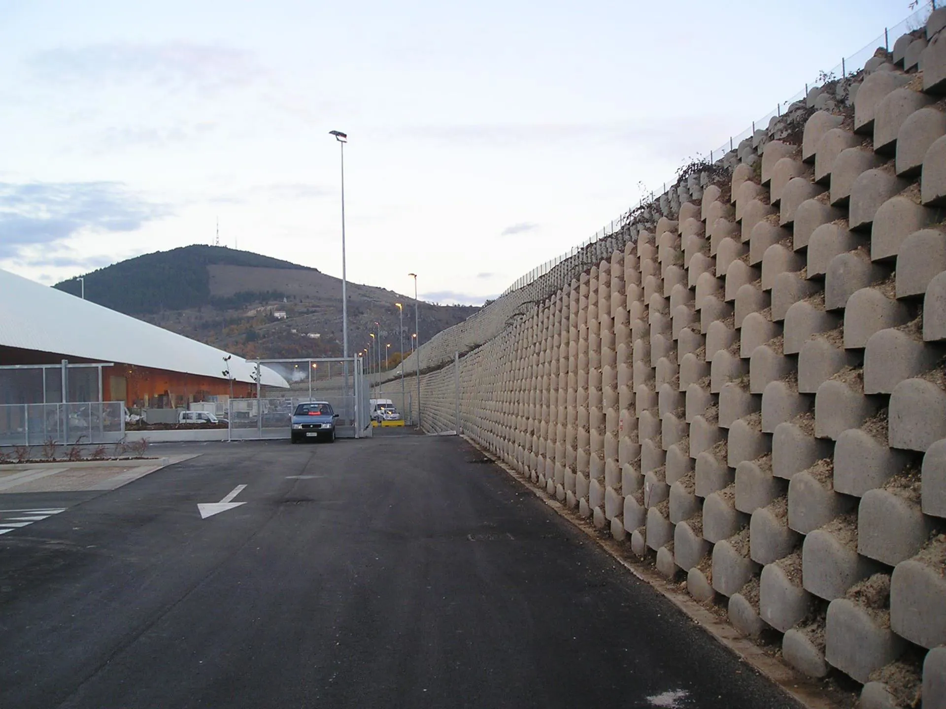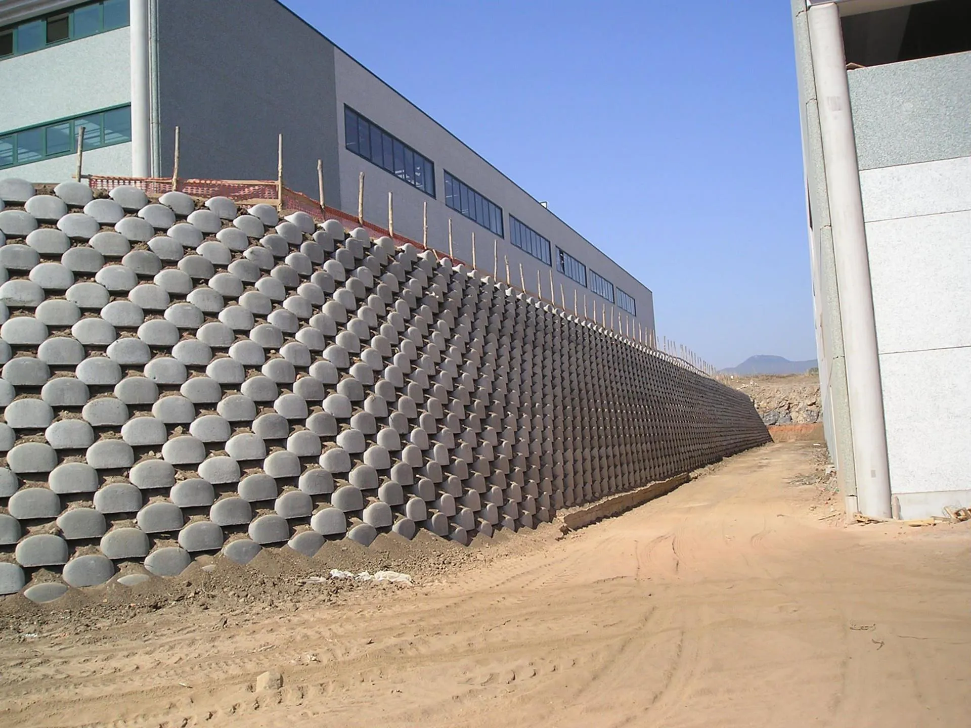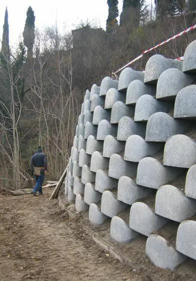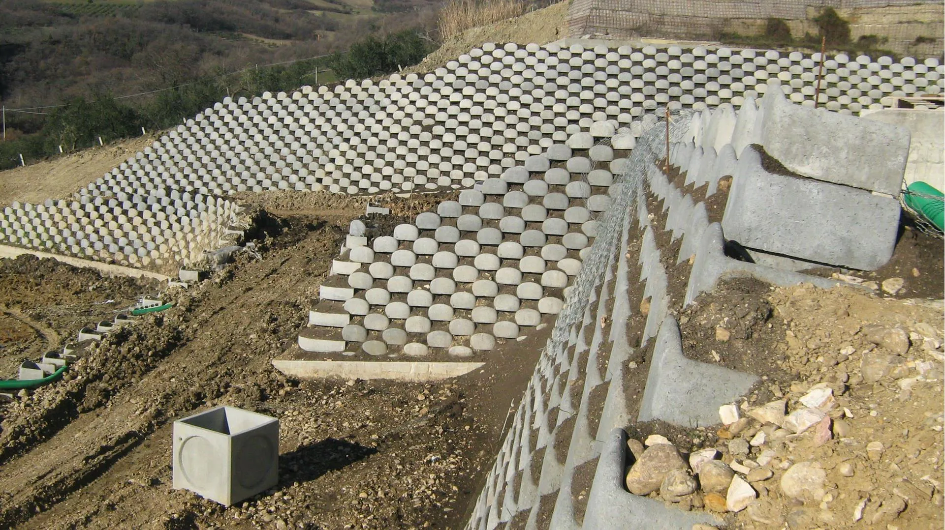 Il continuo approfondimento dello studio dei meccanismi resistenti dei muri a blocchi ha consentito di evolverne il sistema costruttivo introducendo nuove soluzioni che hanno consentito di raggiungere risultati sempre migliori e con maggior grado di sicurezza. L’evoluzione del sistema costruttivo dei muri rinforzati ha portato alla introduzione dell’ARMATERRA BIG LÖFFEL® ovvero di una nuova tipologia di muro di sostegno in terra armata costituita da un paramento frontale realizzato in blocchi BIG LÖFFEL® e da un’armatura retrostante costituita da corsi regolari di rete metallica zincata e rivestita in PVC collegate ai blocchi attraverso apposite forcelle sagomate e zincate a caldo. Tale tipologia costruttiva, scaricando quasi completamente il paramento frontale in blocchi dalle forze agenti sullo stesso può essere adottata per la realizzazione di consolidamenti di scarpate di altezza considerevole e anche di piccoli movimenti franosi.