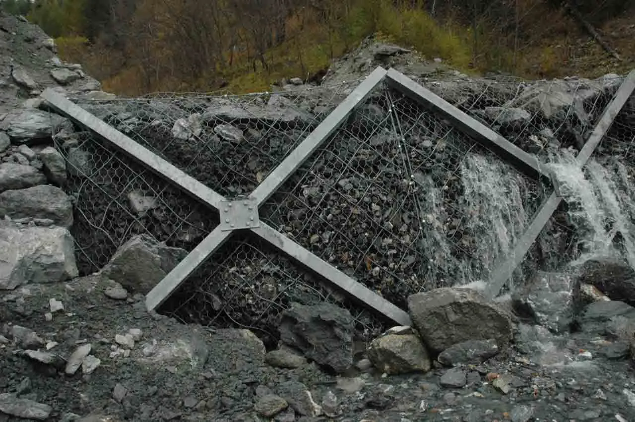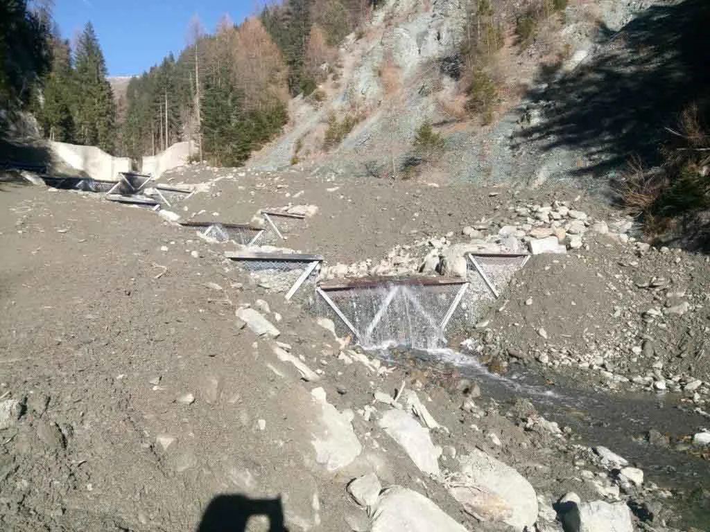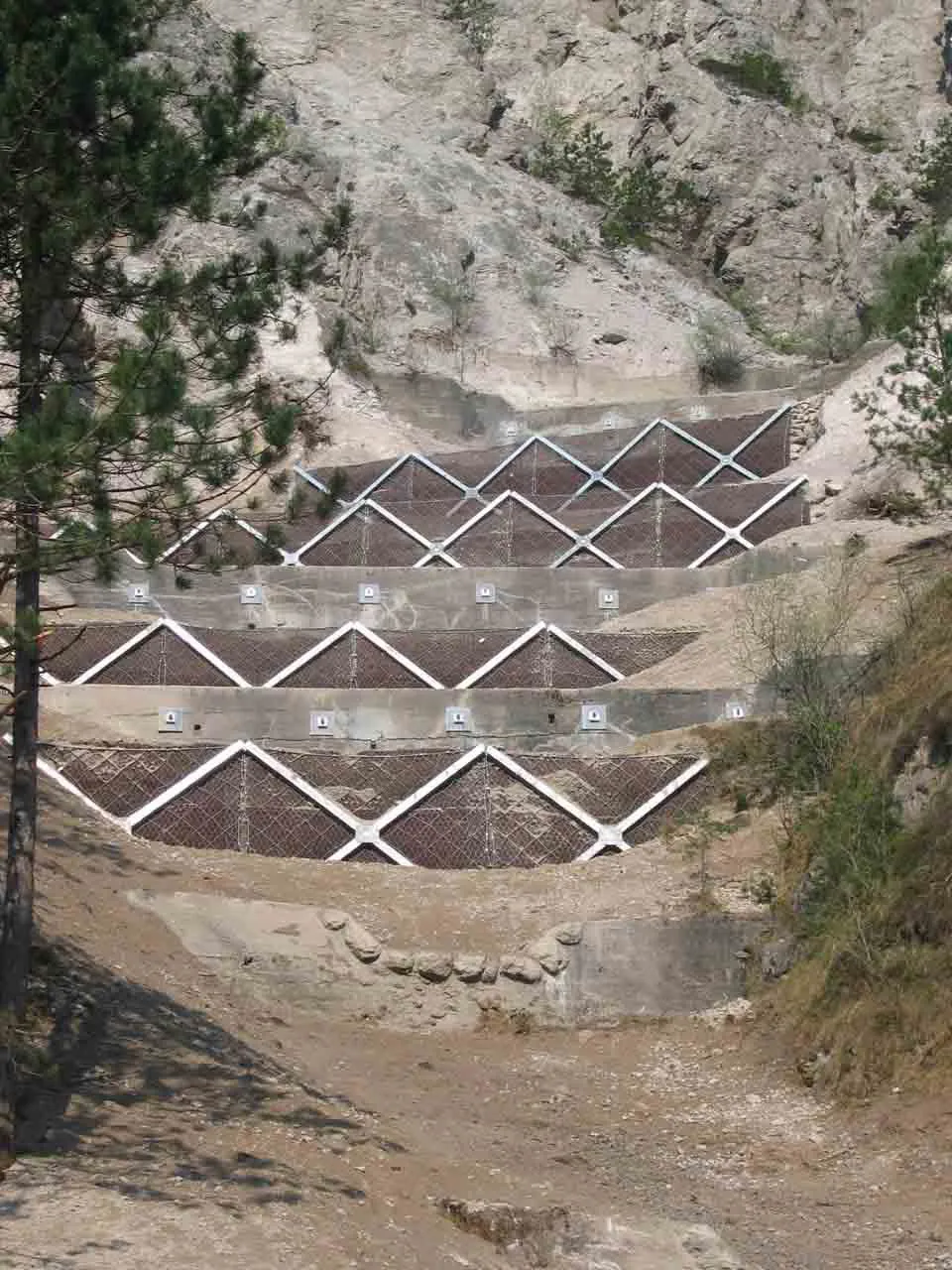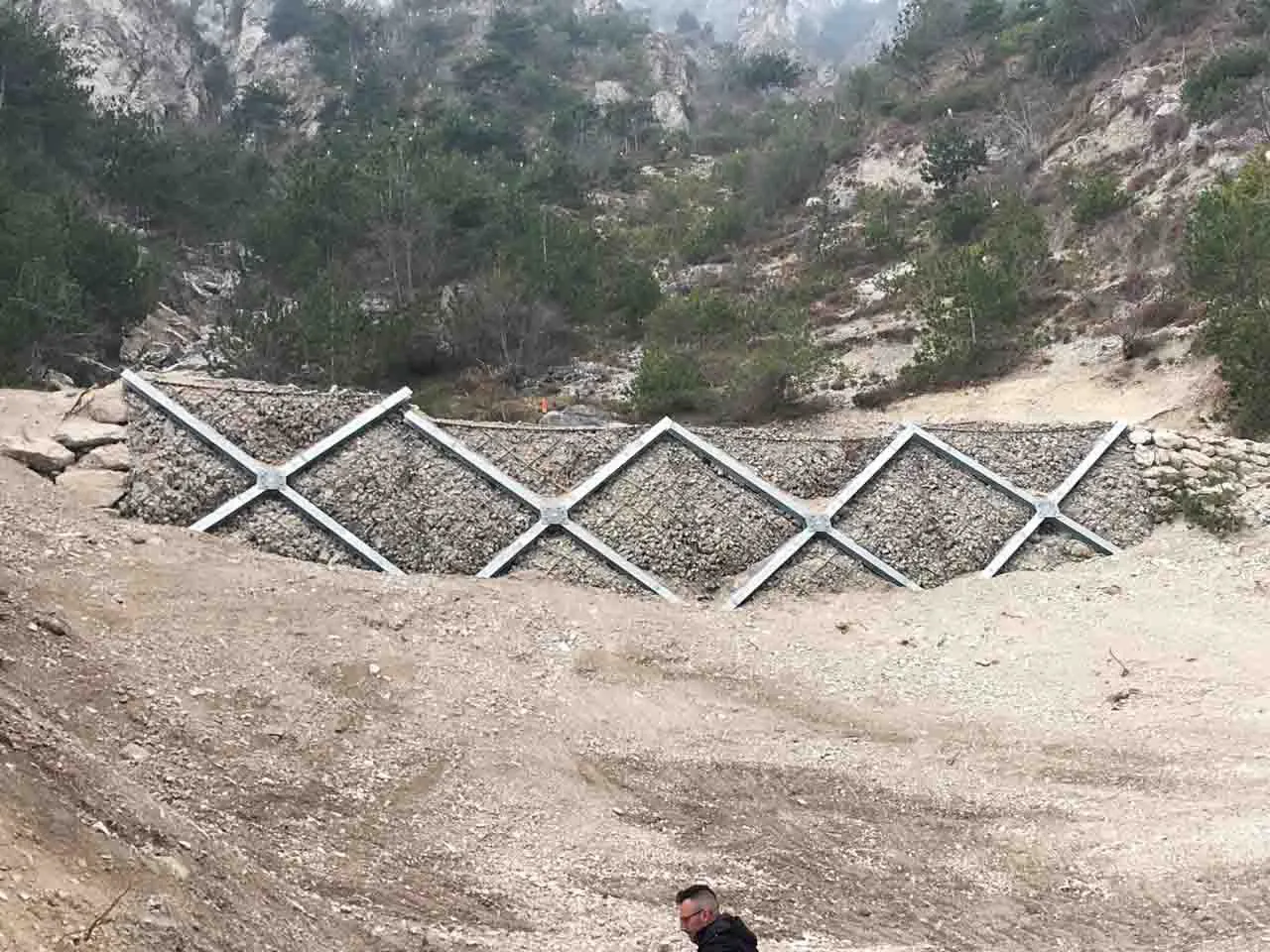 Le strutture Erdox Terra (dim. H310x360 cm ca. o H360x310 cm ca.) rappresentano la soluzione più rapida e sicura per la realizzazione di opere di consolidamento “attivo” di canaloni soggettia a fenomeni di debris-flow.